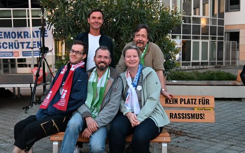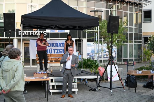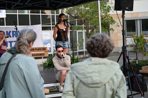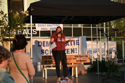 Nachdem der Demonstrationszug wieder auf dem Rathausplatz angekommen war, gab es einen eingespielten Redebeitrag eines Redners, welcher in Thüringen in Sichtweite des KZ-Buchenwald aufgewachsen ist. Er berichtete, als Jugendlicher Überlebende des KZ kennengelernt und von Ihnen gelernt zu haben, dass die Gefahr von Diktatur und Ungerechtigkeit immer vorhanden ist und wir deswegen Tag für Tag bereit sein müssen uns ihr entgegenzustellen.